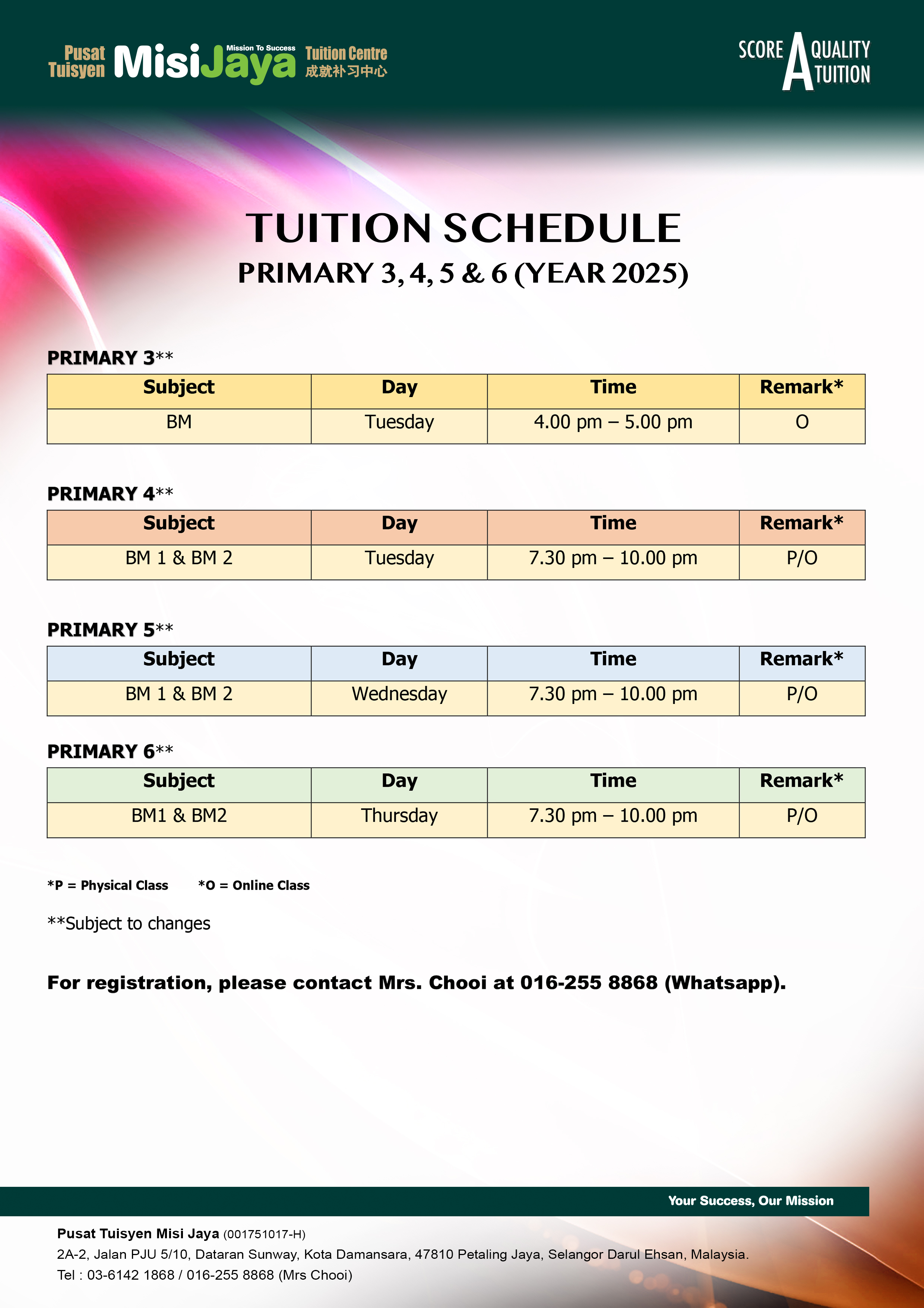 NOTE : All tutors are qualified, experienced, university graduates, good track record, straight A’s & well-versed with the current school syllabus.